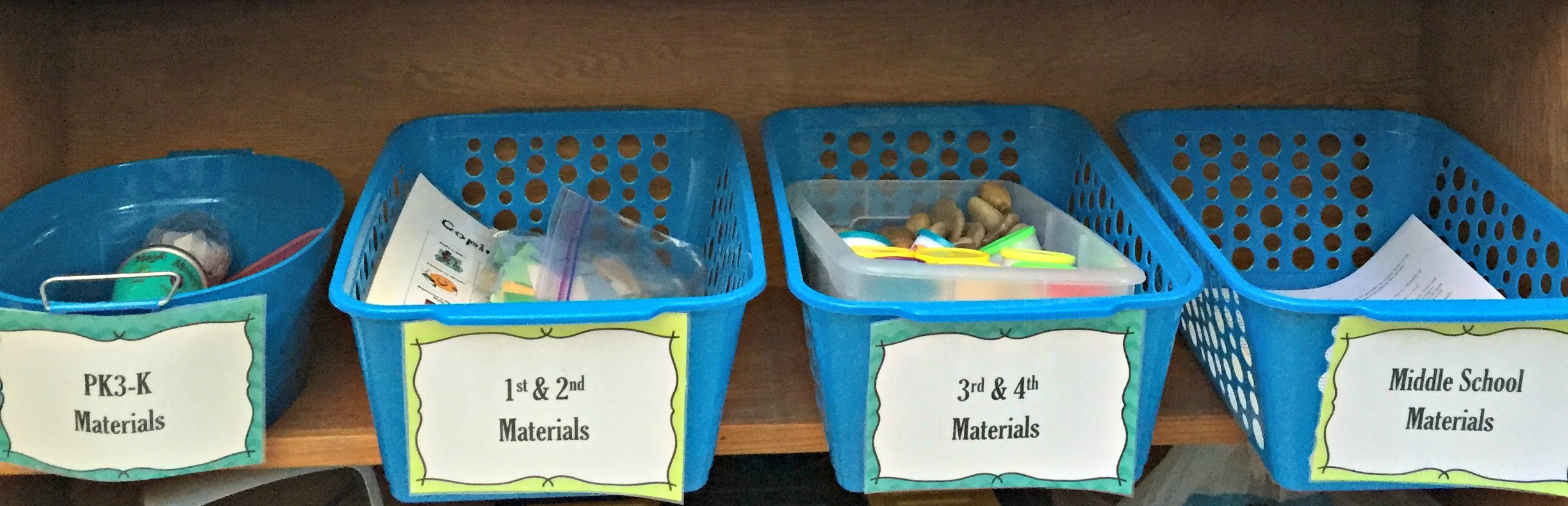 I have labeled bins for all of the lesson materials I am currently using with classes, which are organized by grade level. Since I don’t have all classes from one grade on the same day, this saves me time I used to spend putting away and searching for materials multiple times every month. Once I’ve seen every class in a grade level, I simply clear the bin and immediately fill it with what I need for next month’s lesson.