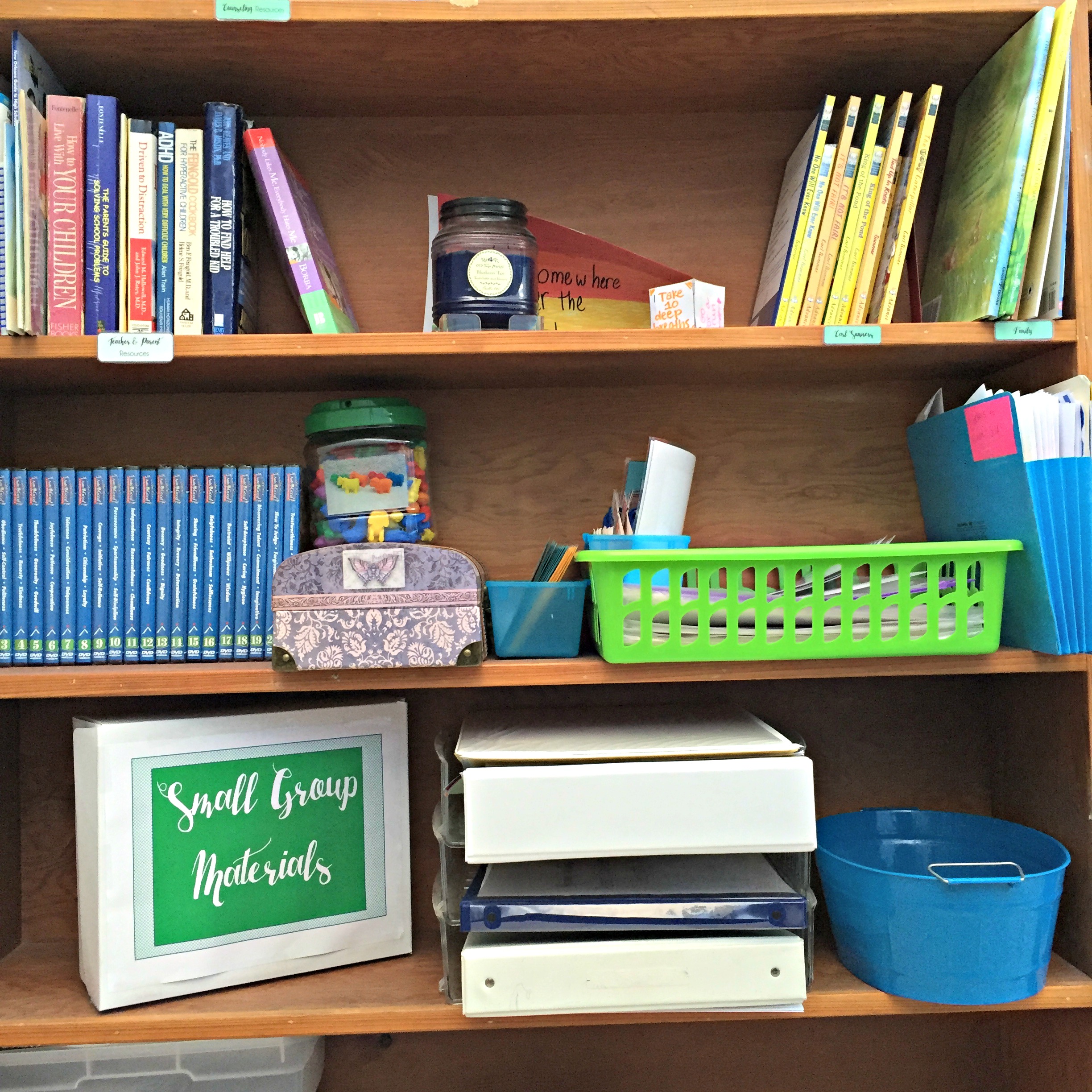 I am fortunate to have a lot of shelf space in my office, but even if you don’t, I firmly believe you can still use many of my organization ideas with a little creativity and many dollar store containers. As you can see in the pictures below, I have designated spaces for books, art supplies, and classroom lesson materials.