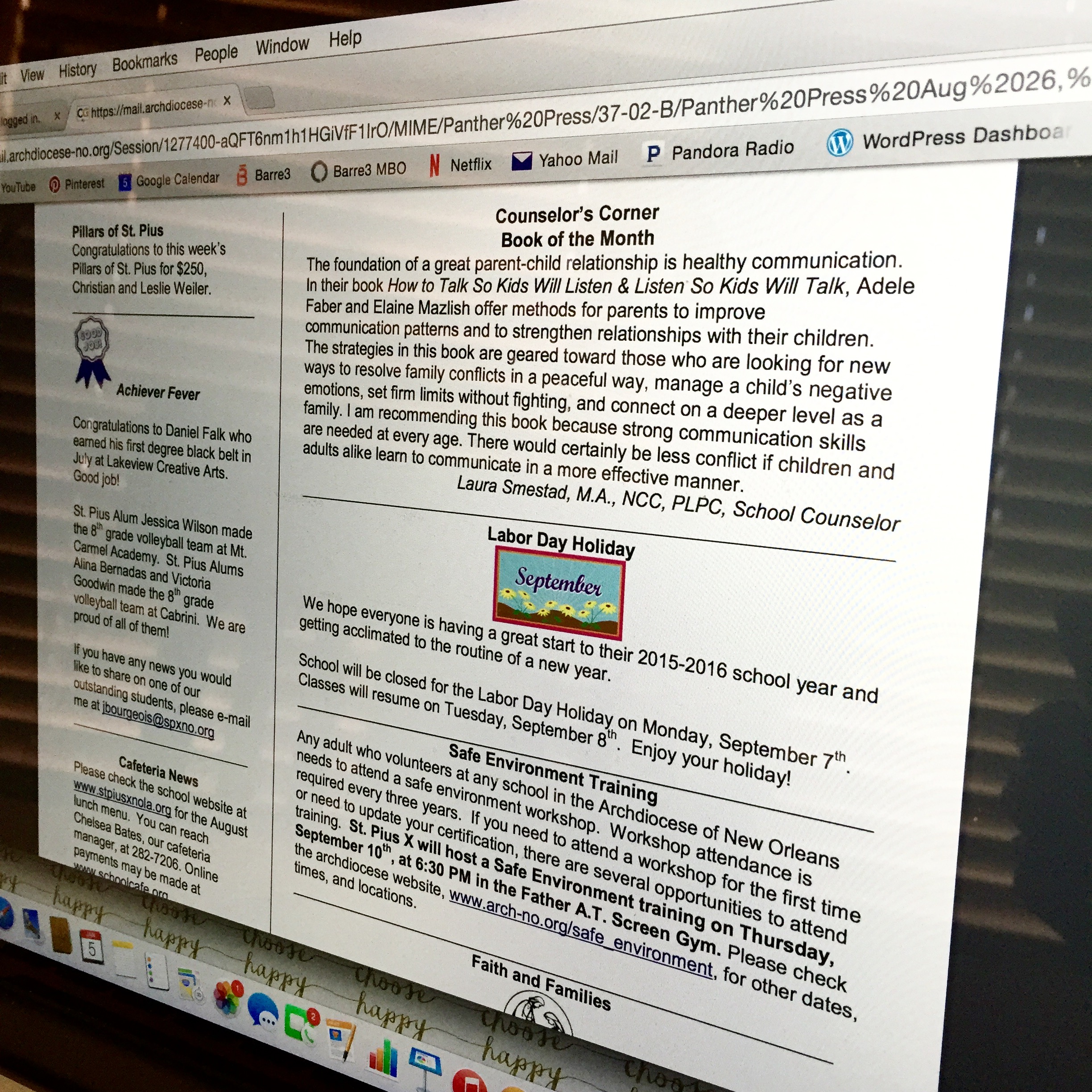 I often relate my pieces back to what I am doing with the children at school so the parents stay informed and can reinforce important concepts at home. For example, this month, I am doing lessons on bullying and kindness in the lower grades and cyberbullying and cyber safety in the middle grades. My newsletter columns this month are about teaching empathy to children, keeping kids safe online, and the differences between bullying and normal peer conflict. The parents and children receive a lot of the same information with the same vocabulary in hopes that they will talk about these things at home.