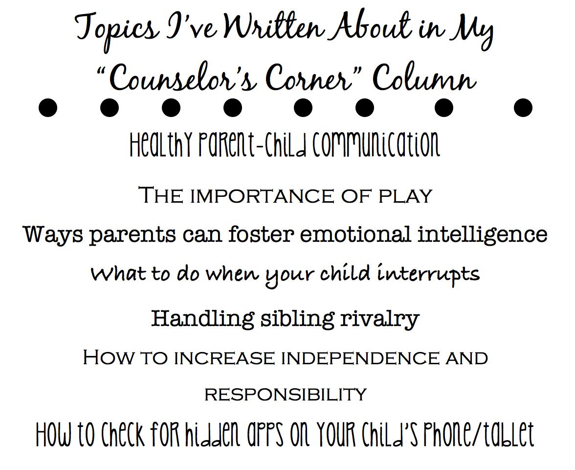 Sometimes I pull ideas and quotes from parenting articles, other times I give book recommendations, but my writing is always geared toward things that are beneficial for parents to know. Here are some topics I’ve included in this year’s “Counselor’s Corner” column: