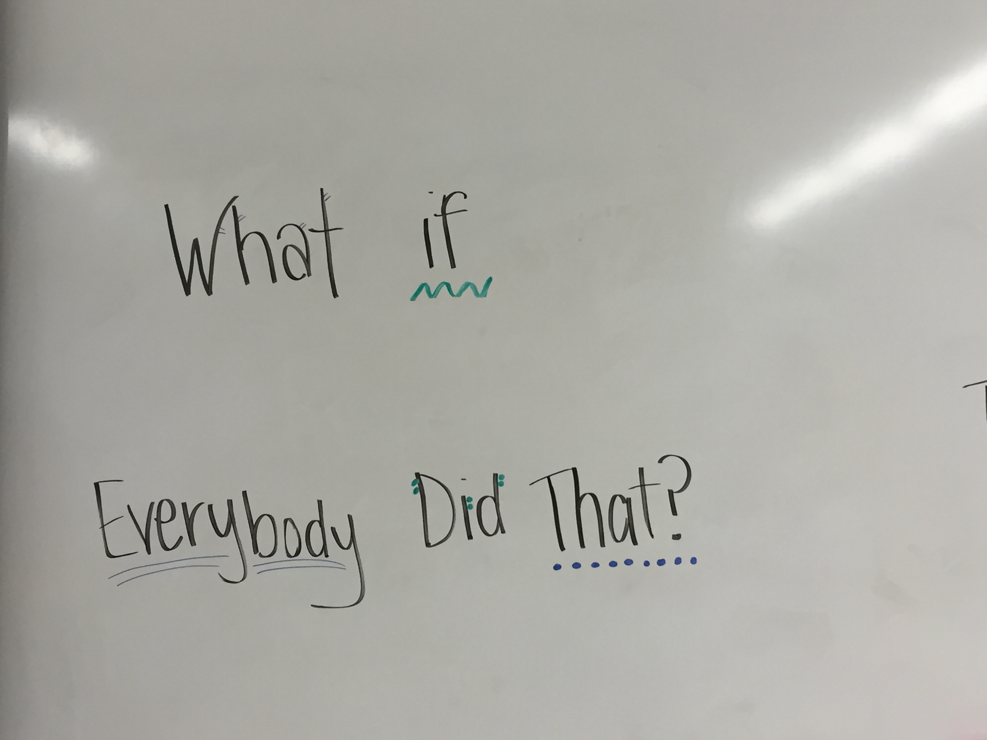 I begin the lesson by reading the book to the class. I have the students help me tell the story by saying out loud, “What if everybody did that?!” whenever an adult in the book says it. This makes the story more interactive and reinforces the phrase with the children.