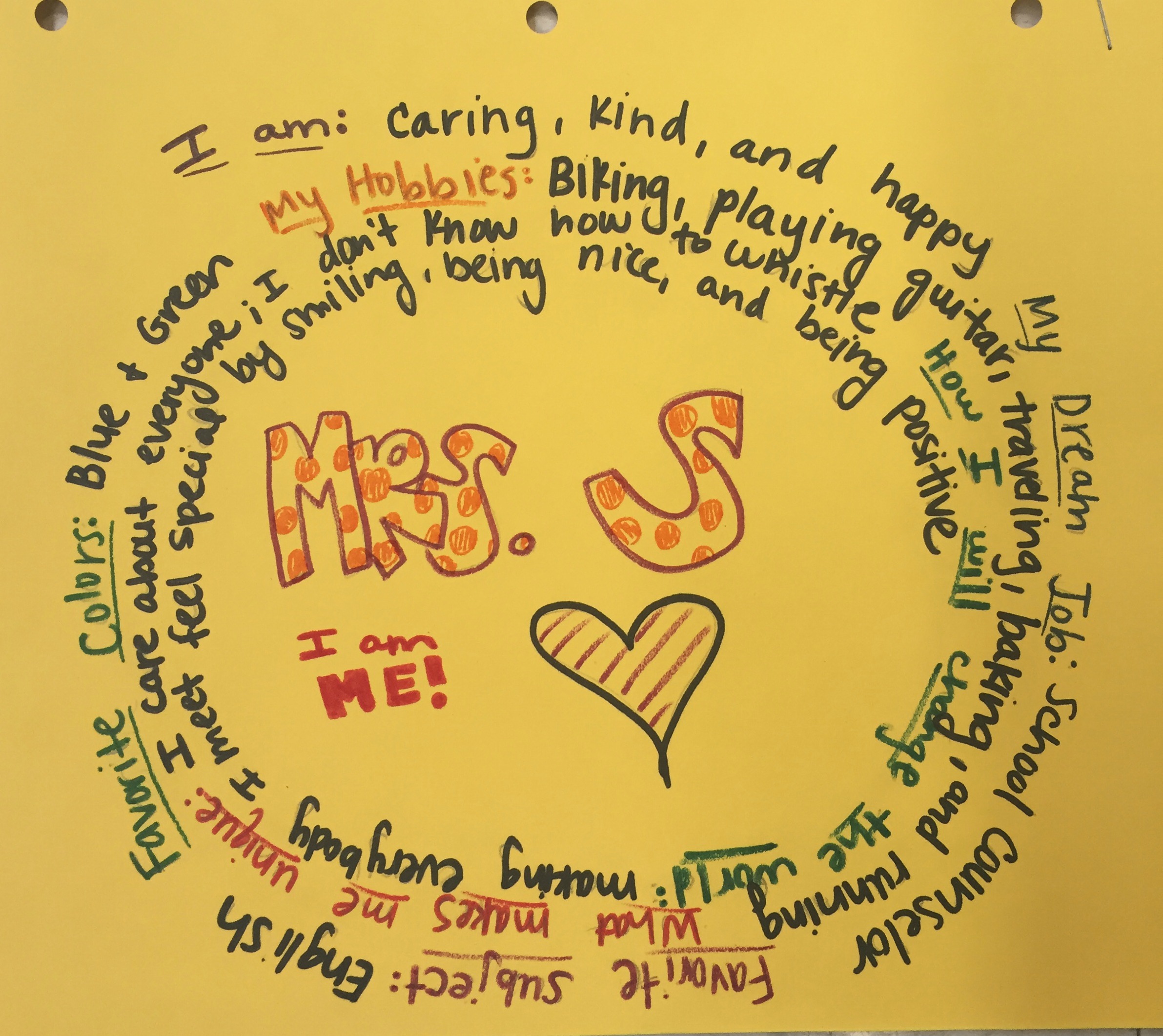 This lesson from The Middle School Counselor {link to original post here} gives students the opportunity to know more about their classmates and to know more about how they define themselves. Each girl writes the following facts about herself in a spiral shape: (1) I am… {for this I had each participant write at least 3 adjectives describing herself} (2) My Dream Job (3) Favorite Subject (4) Favorite Color (5) My Hobbies (6) What Makes Me Unique (6) How I Will Change the World. Each student then shares her creation with the group, and we discuss our unique qualities.