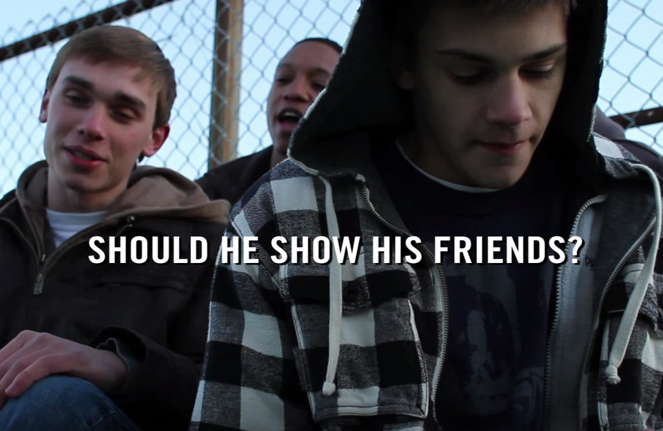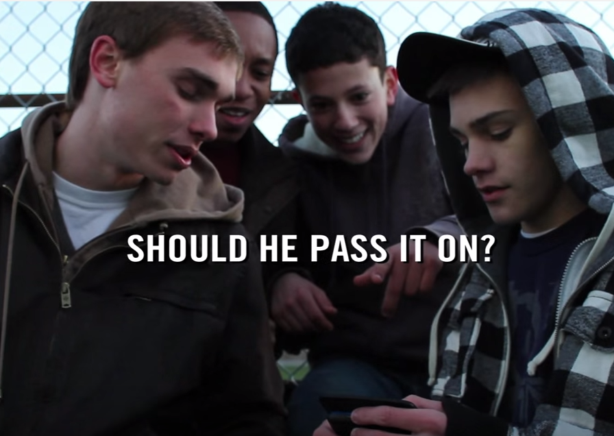 After clicking on “no” again, the 3rd clip {Out of Your Hands} begins, which starts with a screen that says, “Sorry. You no longer have a choice.” In this video, we see the boy show his friends, who want him to text it to a friend who isn’t present. The question at the end is, “Should he pass it on?”