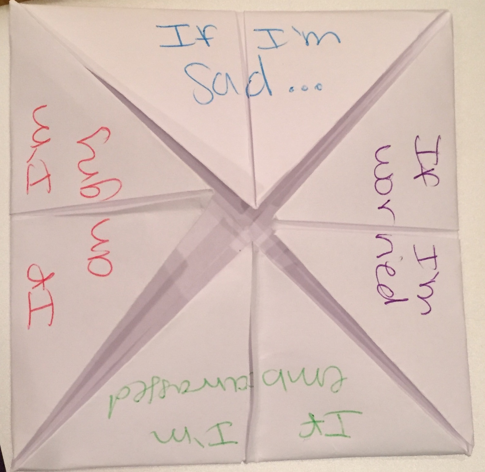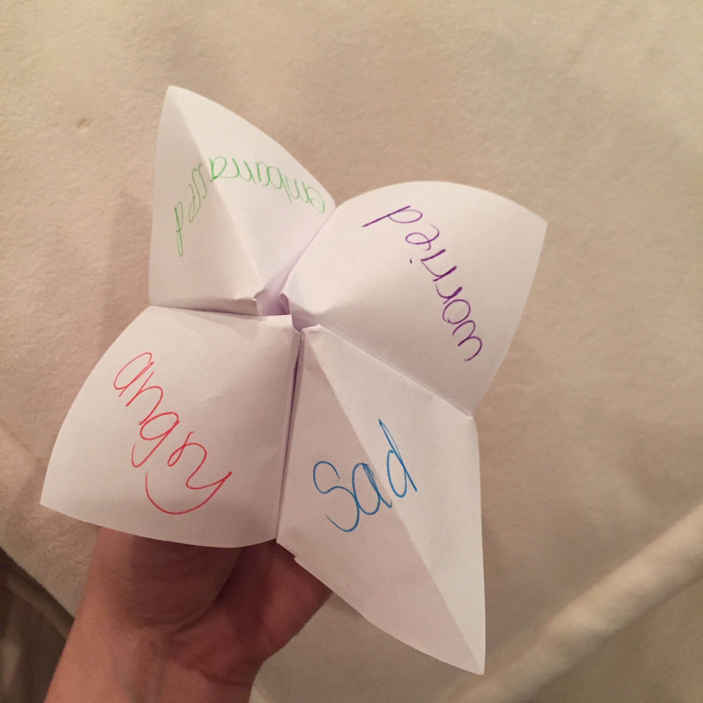 I’m sure we all remember making “cootie catchers” or “fortune tellers” as children, and it’s still a hit with the kiddos! {If you don’t remember how to make them, check out this YouTube tutorial.} I begin this activity by talking about the different feelings we might have when thinking about our parents’ divorce. The group members usually identify emotions such as sad, angry, embarrassed, lonely, and worried.