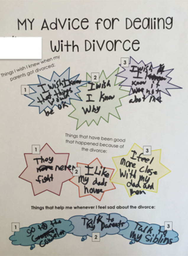 This activity gives students an opportunity to help other kids who are going through similar things in their families. Each sheet has 3 sections: “Things I wish I knew when my parents got divorced, “Things that have been good that happened because of the divorce,” and “Things that help me whenever I feel sad about the divorce.”