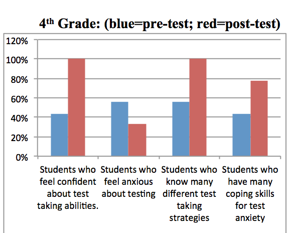 If students in the group report feeling nervous or anxious about testing in the pre-test questionnaire, the group will talk about coping skills they can use when experiencing testing anxiety. This group discussion seems to help the students feel less alone in their worries and more empowered to try ideas that were shared in the group for coping with anxiety or nerves.
