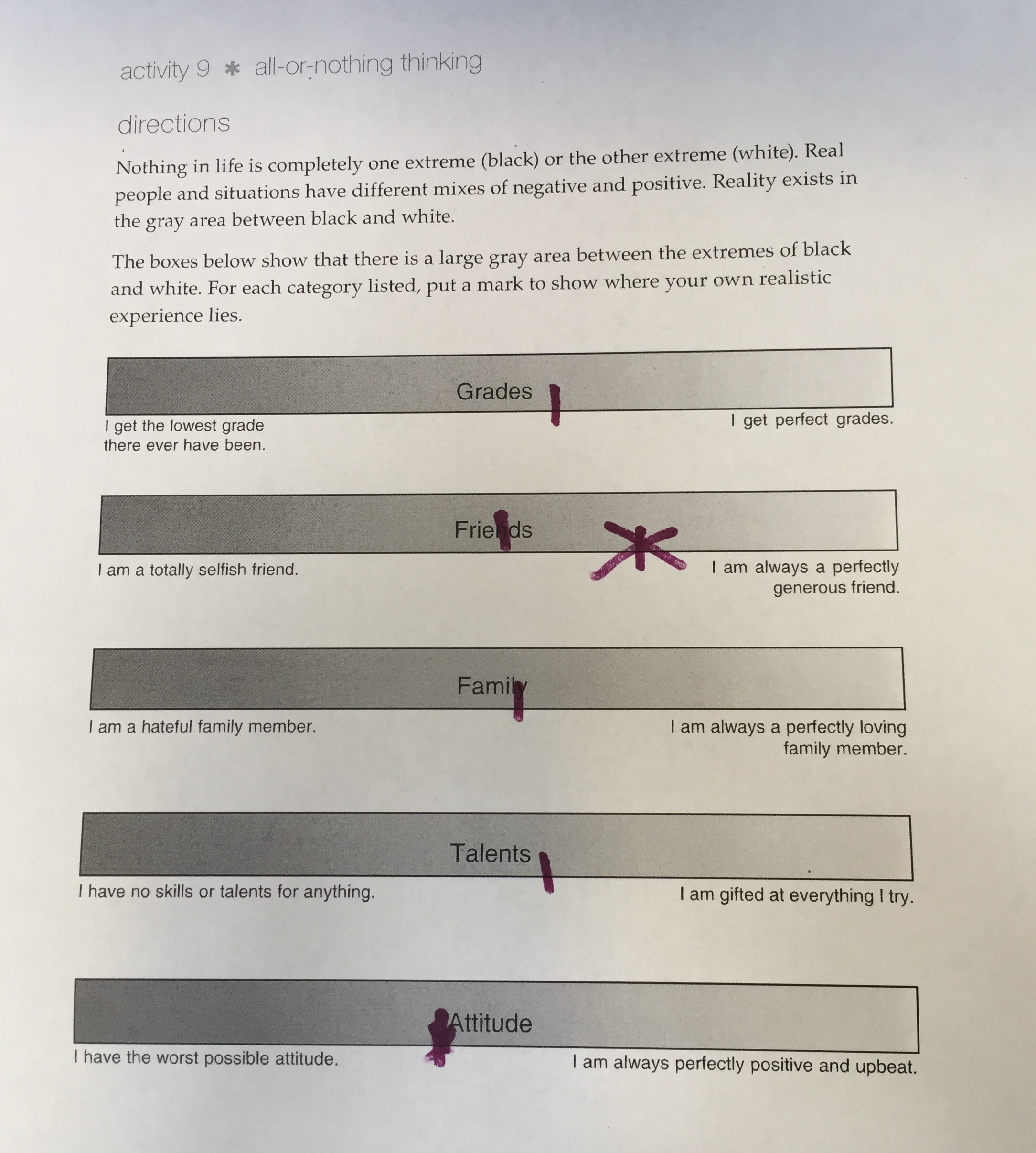 One reason I love this workbook so much is that it is very CBT based, which is the primary theoretical orientation from which I operate. I have one student in particular who really connects with the CBT principle of reframing thoughts, so I used this workbook in my sessions with her. Throughout the school year, as this child battled anxiety, we covered the following topics from the workbook: “How You Experience Anxiety,” “Worrying is Worthless,” “All or Nothing Thinking,” “Overgeneralizing,” “’Should’ Statements,” and “Thought Stopping.” {There are MANY other sections of the workbook—these are just the ones I decided to focus on with this particular student.}