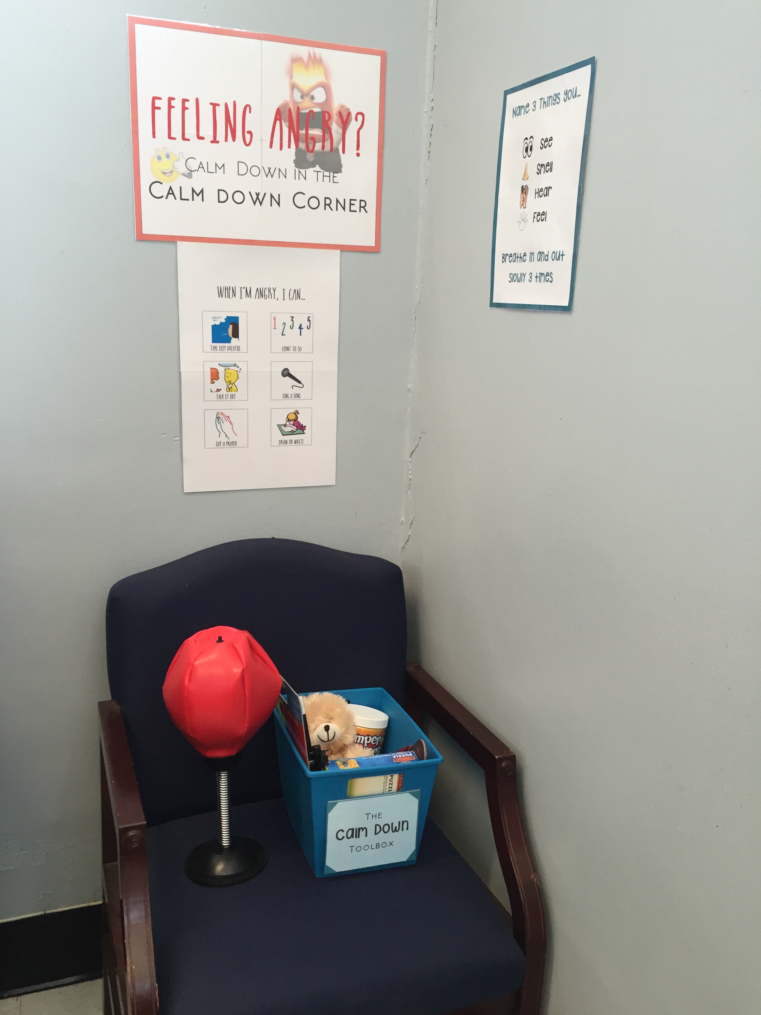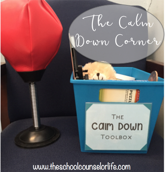 Last year, I worked with a 5th grade boy who struggled to control his anger. Throughout our time together, he repeatedly made the recommendation that I should have a punching bag in my office for the times that students are so angry they want to hit something {a way he often felt}. I thought this was a great idea, and it led me to create the Calm Down Corner in my office.