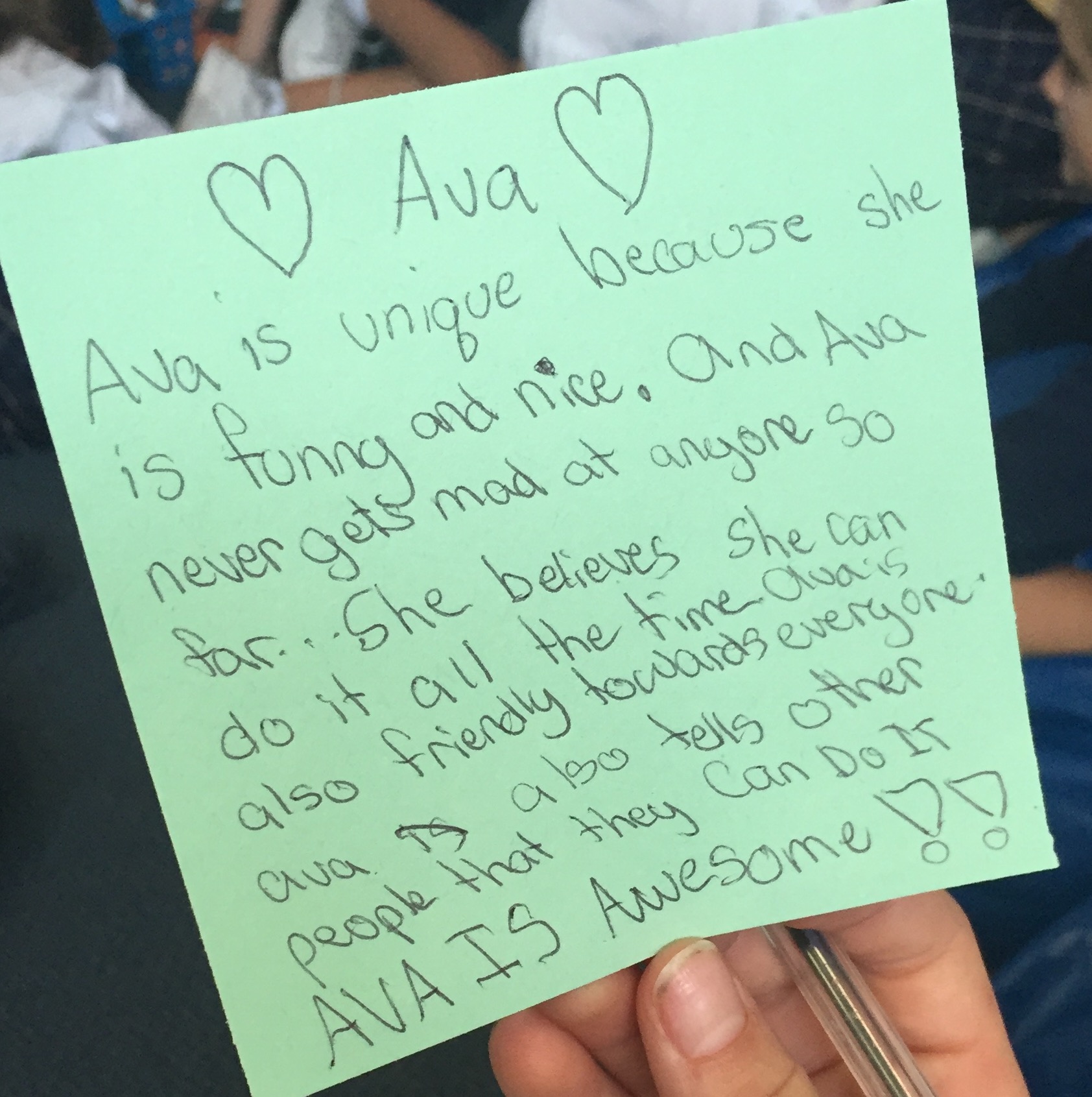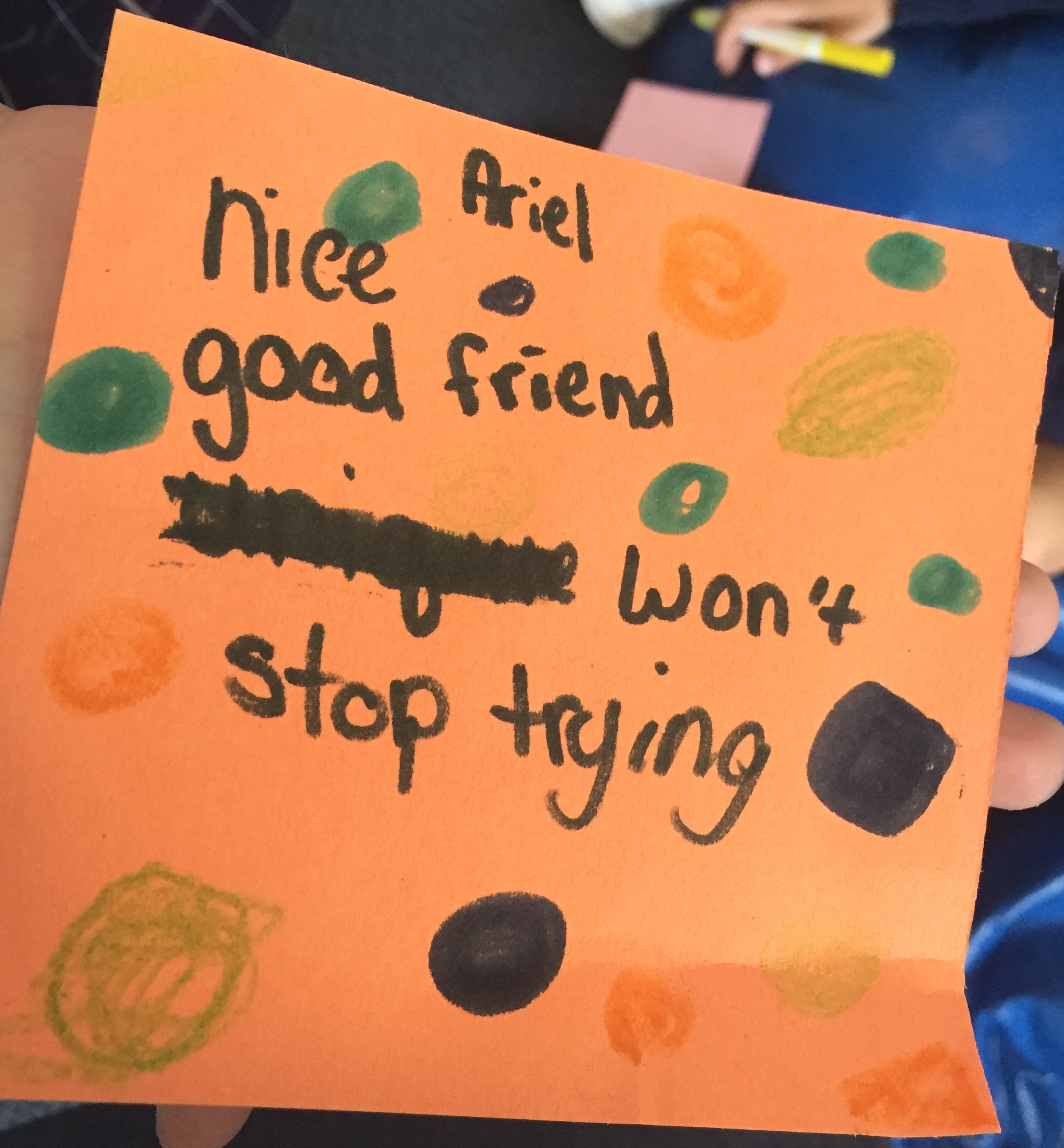 - Introduce activity: Pass out black squares of construction paper, and instruct group members to write or draw at least 3 things that make they dyad partner unique or special. Allow girls to share what they wrote/drew with the group {see examples below}.