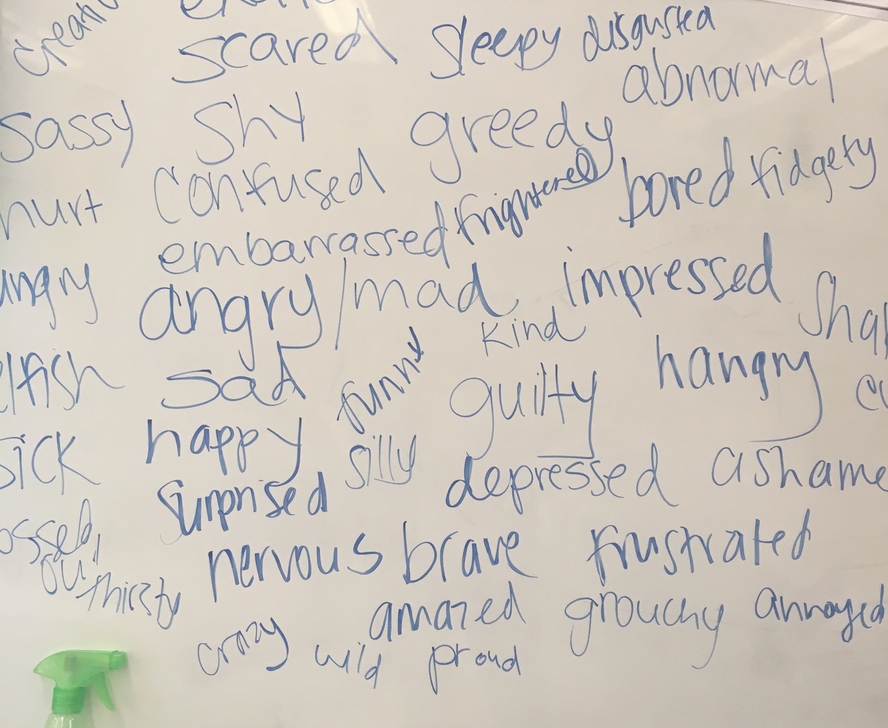 I begin the lesson by asking the students to name as many feeling words as possible, and I write all of their responses on the board. We talk about what the words mean as they are written down, and I usually add a few of my own in the mix to teach them about some feelings they may not already know how to identify.