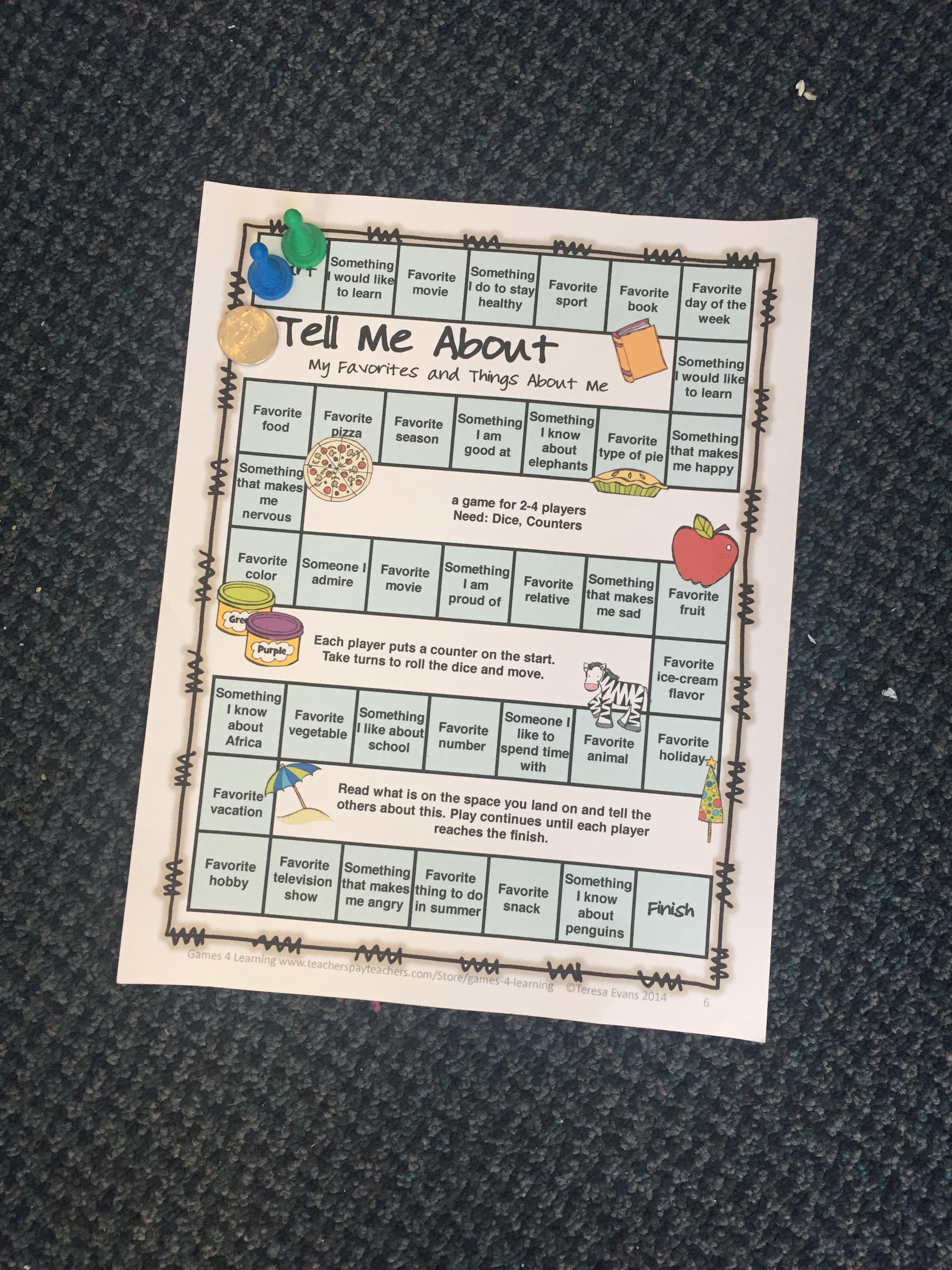 This is one of my favorite games to get to know students better and help them feel comfortable in my office. Each space includes a favorite thing that the player who lands on it shares with the other players. To make the game last longer, I play by flipping a coin instead of using a die. If the coin lands on heads, the player moves one space forward, and if it lands on tails, the player moves two spaces. You can download the game here.