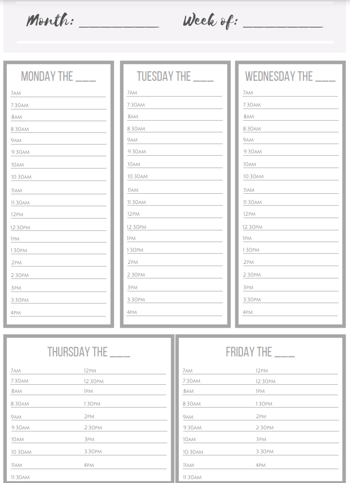 - Weekly Calendar Pages (with times from 7am-4pm Monday-Friday)